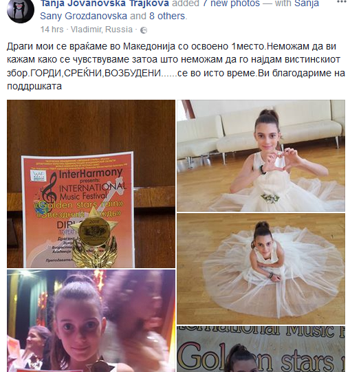 Најрадосна и највозбудена беше нејзината мајка Тања, којана својот фејсбук профил објави фотографии и статус, гордо покажувајќи ја дипломата и наградата за освоеното прво место на својата ќеркичка.