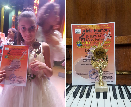Деновививе младата кумановка она што го носи како музички и вокален потенцијал во себе, го круниса со награда донесена од големата Русија. Малечката Гага, учествуваше на еден од најпрестижните фестивали во источна Европа, интернационалниот музички фестивал „Golden stars rain“, од каде се врати како победник.