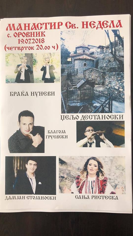 По повод празникот Св. Недела на ден 19.07.2018 (четврток ) во 20 часот, во манастирот Св. Недела во село Оровник ќе се одржи богослужба, а веднаш потоа следува богата културно-уметничка забава со познати музички имиња од македонската естрада.