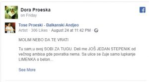 Сестрата на нашиот Тоше Проески на својот Фејсбук профил постојано објавува емотивни статуси поврзани за прерано починатиот пејач.