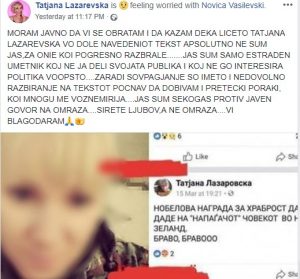 -Морам јавно да ви се обратам и да ви кажам дека лицето Татјана Лазаревска во долу наведениот текст апсолутно не сум јас, за оние кои погрешно разбрале. Јас сум само естраден уметник кој не ја дели својата публика и кој не го интересира политика воопшто. Заради совпаѓање со името и недоволно разбирање на текстот почнав да добивам претешки пораки кои многу ме вознемирија. Јас сум секогаш против јавен говор на омраза. Ширете љубов а не омраза, напиша Татјана на војата објава,