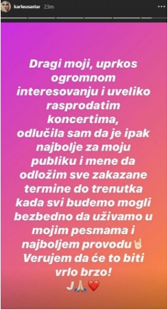 – Драги мои, и покрај огромниот интерес и распродадените концерти, решив дека сè уште е најдобро за мојата публика и за мене да ги одложувам сите закажани датуми до моментот кога сите можеме безбедно да уживаме во моите песни и добра забава.–напиша Јелена.