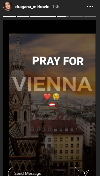 „Многу сум потресена, цела ноќ не спиев гледајќи вести, а моите мисли и молитви се насочени кон настраданите во нападот во Виена и вакво нешто никогаш да не се повтори. Во овој момент сакам да ви порачам да се чувате себе и своите блиски. Ве сака Драгана“, заклучи Мирковиќ.