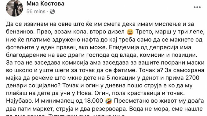 За самохрана мајка да речеме што мкне дете на 5 локации у денот и прима 2700 денари социјално? Точак и огин у дневна пошо струја е ко да му плаќаш на дете да учи у Нова. Огин, пола краставица и точак.