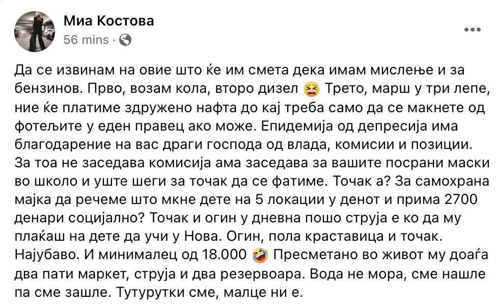 Нашата позната инфлуенсерка, Миа Костова, на својот профил на социјалните мрежи, ги прокоментира новите цени на горивата: