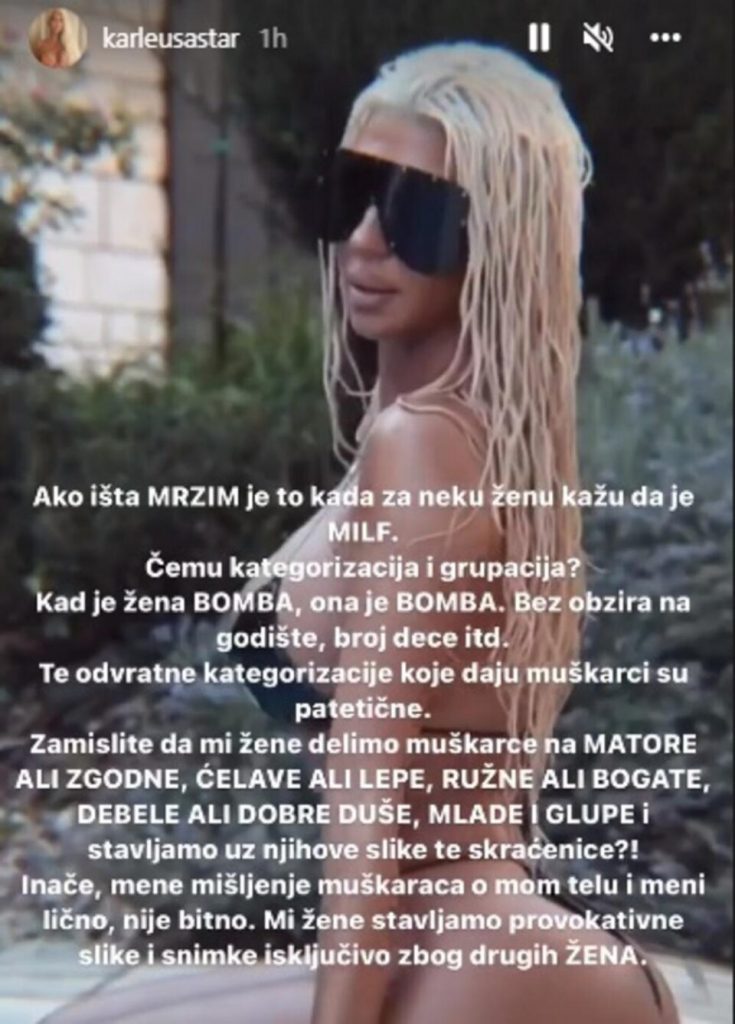 „Ако има нешто што мразам, тоа е кога вели дека жената е MLIF. Зошто категоризација и групирање, кога жената е бомба, таа е бомба. Без разлика на возраст и број на деца. Патетични се тие одвратни категоризации што ги даваат мажите. Замислете, ние жените ги делиме мажите на стари и млади, но не и на згодни, ќелави, убави, дебели, добри души или глупави, а дали ние тие кратенки ги ставаме до нивните фотографии ?! Инаку, мислењето на мажите за моето тело и за мене лично не е точно. Ние жените објавуваме провокативни фотографии и видеа исклучиво за другите жени“, напиша Карлеуша на социјалната мрежа Инстаграм.