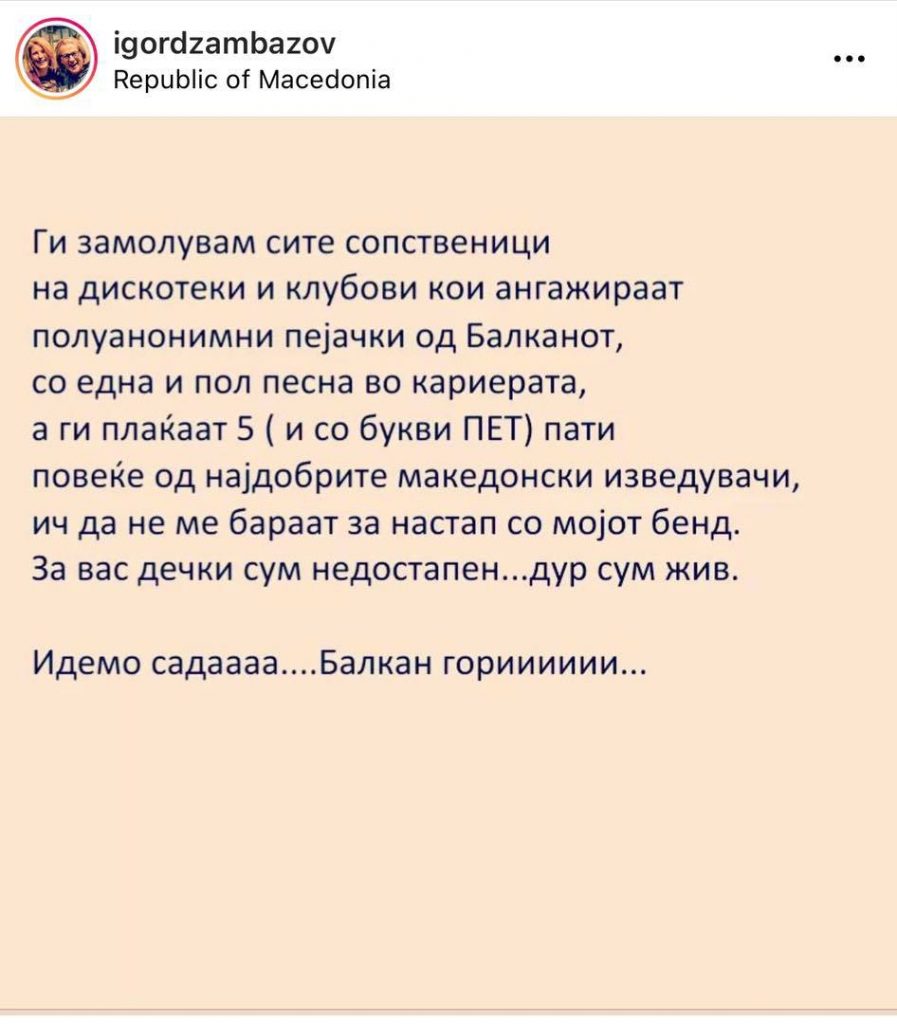 Игор Џамбасов со порака до Македонските дискотеки кои носат пејачи од соседството April 26, 2022 естрадаплус Новости 0 Please follow and like us: Please follow and like us: