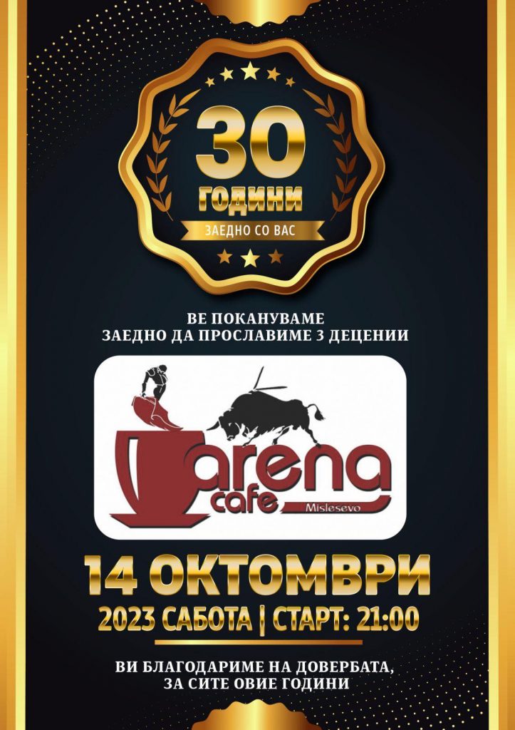 Јубилеј 30 години на Кафе барот Арена Мислешево , овај кафе бар е најпознат а може и најстар во Струшко. Во Арена настапувала скоро цела Македонска фолк естрада , прославата е закажана за во Сабота на 14 Октомври ,каде ќе ве забавуваат повеќе музички имиња .