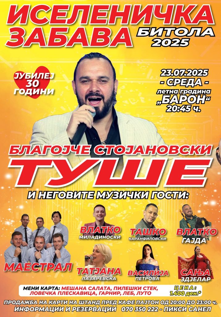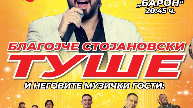 Еден од најголемите хитмејкери на македонската фолк-сцена, Благојче Стојаноски – Туше, го најавува својот јубилеен концерт на 23 јули во летната градина на Барон во Битола – настан кој ветува незаборавна вечер исполнета со емоции, музика и врвни гостувања.