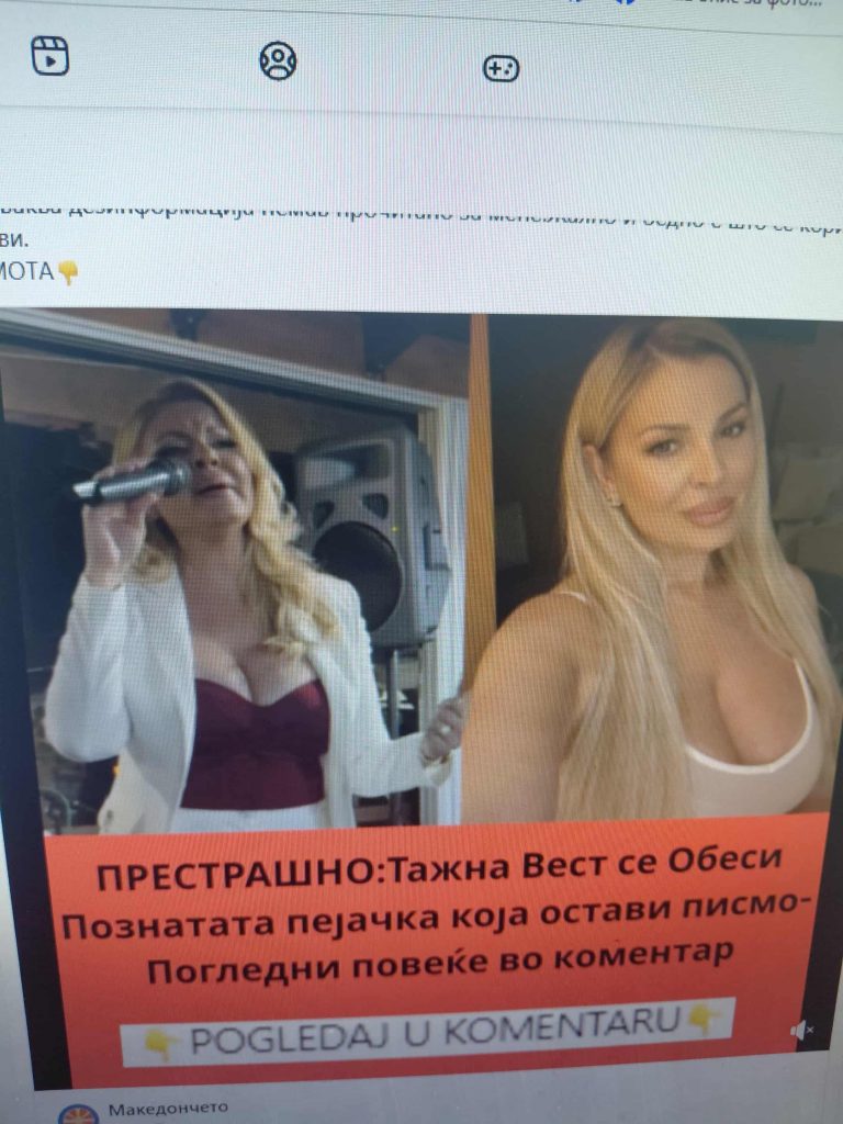 Вечерва на социјалните мрежи се прошири шокантна и целосно неточна информација дека фолк пејачката Елена Велевска наводно се обесила. Веста за кратко време предизвика паника и реакции кај јавноста.